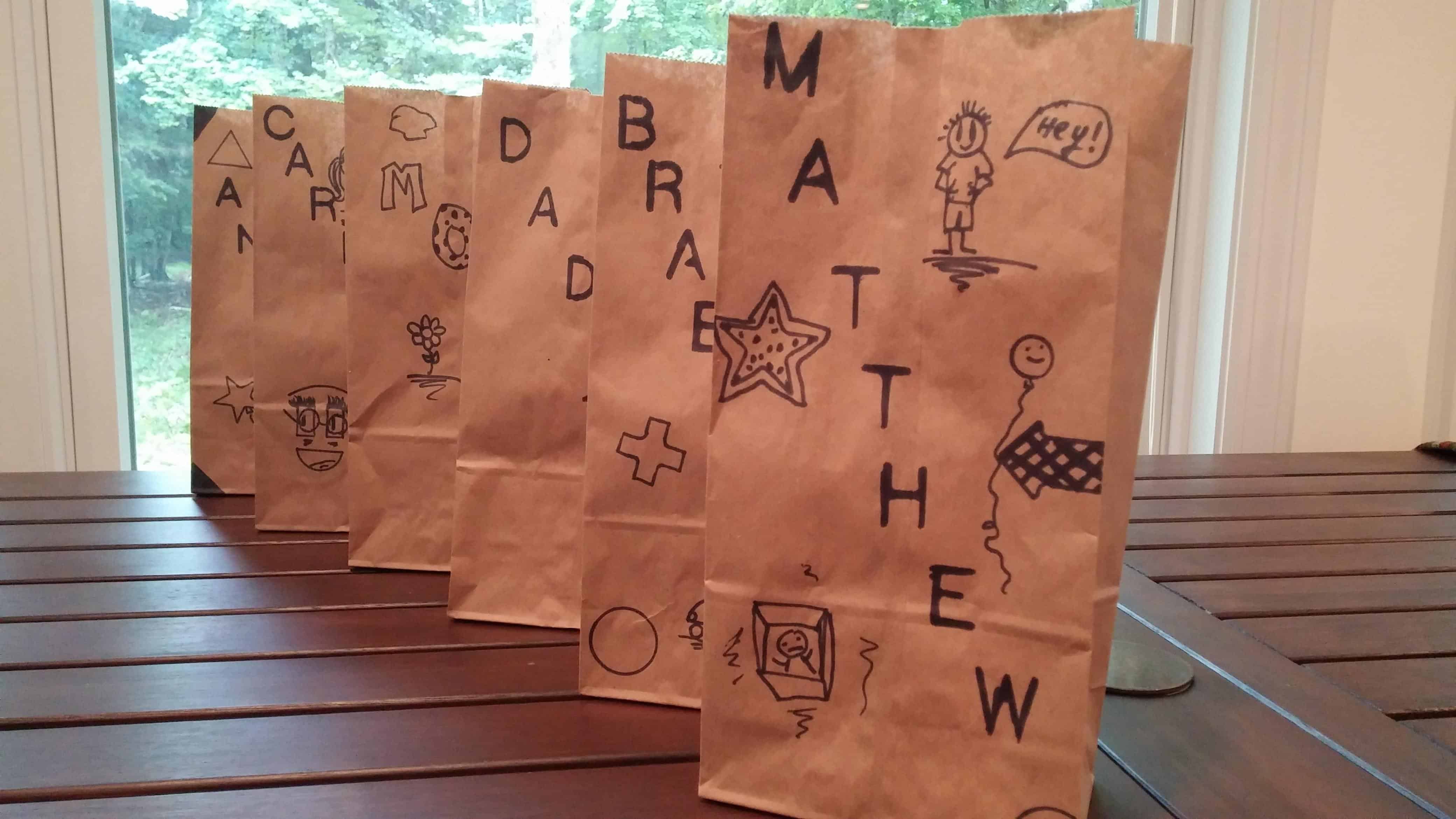 After we wrote out our notes, we put the note for that person in a brown paper bag with his/her name on it.  (You can see the actual bags we used up above.  Anna, our creative daughter, decorated them for us).  Then, usually at dinner, we took turns reading the notes we received out loud.